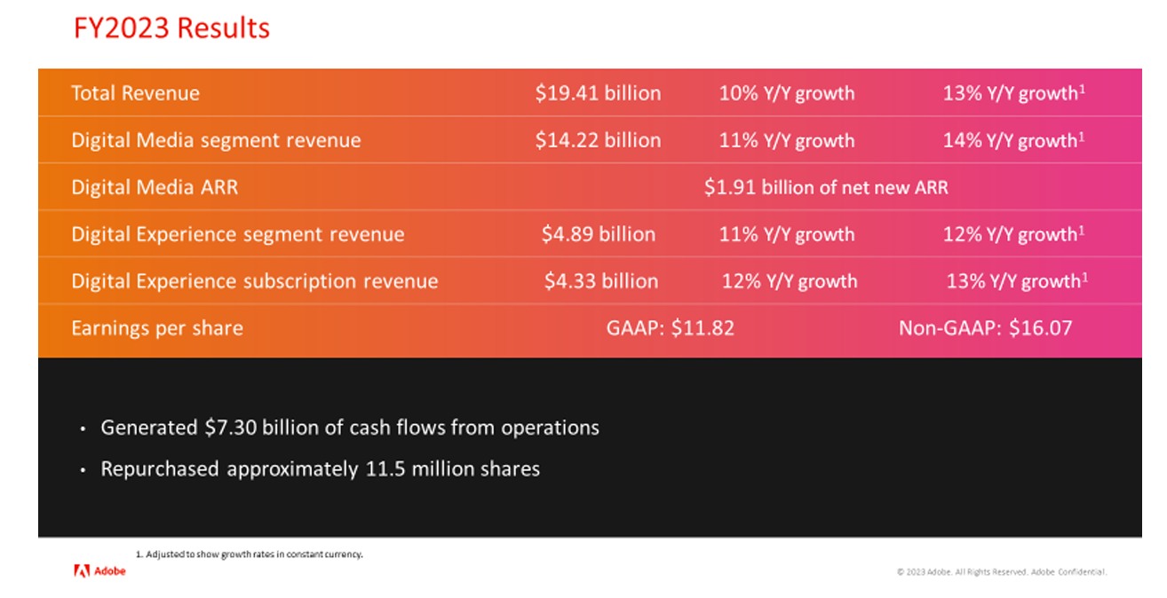For fiscal 2023, Adobe reported revenue of $19.41 billion, up 10% from a year ago with net income of $5.43 billion, or $11.82 a share.