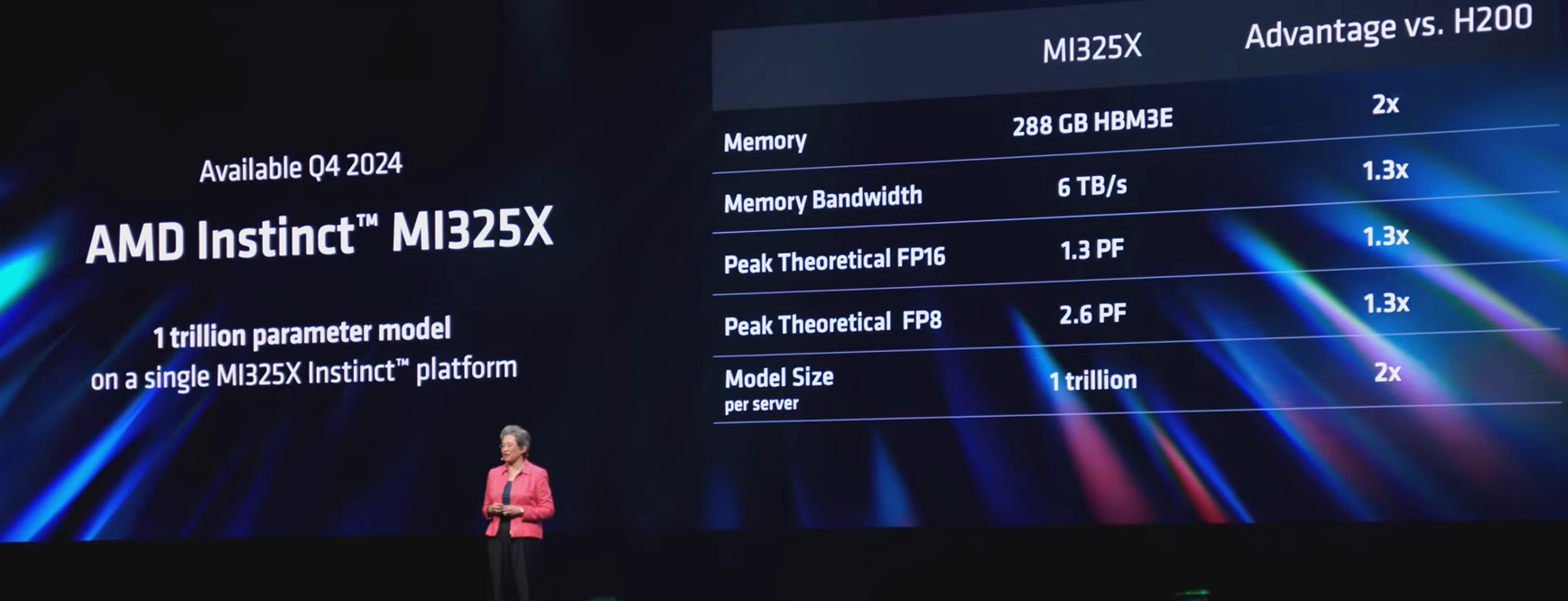 Su said the new AMD Instinct MI325X accelerator will be available in the fourth quarter with up to 288GB of HBM3E memory and 6 terabytes per second of memory bandwidth with new AMD Instinct MI350 accelerators based on AMD's CDNA 4 architecture available in 2025.
