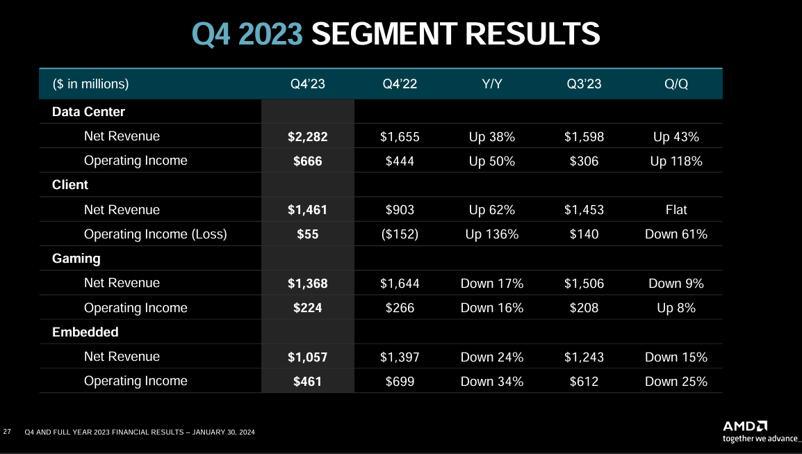 Data center revenue in the fourth quarter was $2.3 billion, up 38% from a year ago. Sales were driven by EPYC CPUs and AMD Instinct GPUs.