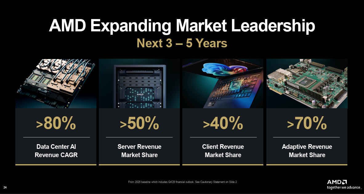 - The company sees its EPYC CPU server chip portfolio gaining more than 50% market share. In data center AI, AMD sees CAGR of more than 80%.