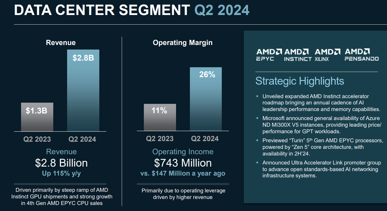 AMD's second quarter was paced by $2.8 billion in data center revenue, up 115% from a year ago.