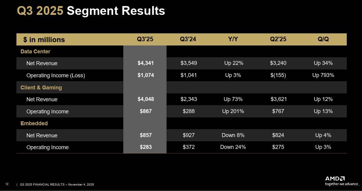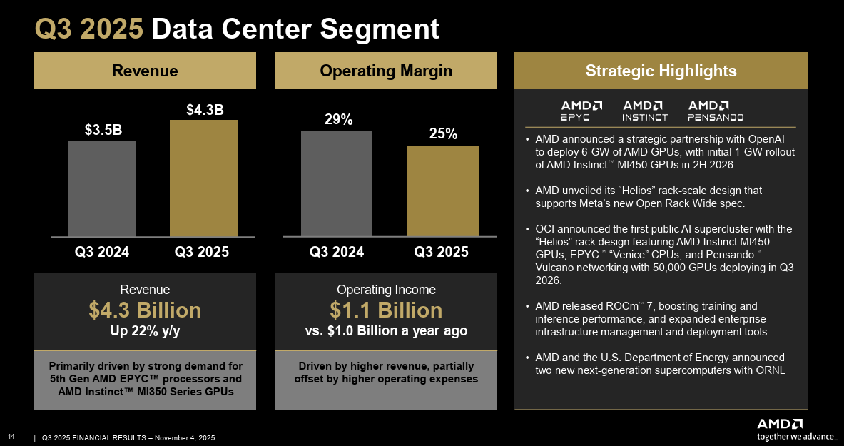 - Data center sales in the third quarter were $4.3 billion, up 22% from a year ago, with strong demand for 5th Gen AMD EPYC processors and AMD Instinct MI350 Series GPUs. Data center operating income was $1.07 billion.