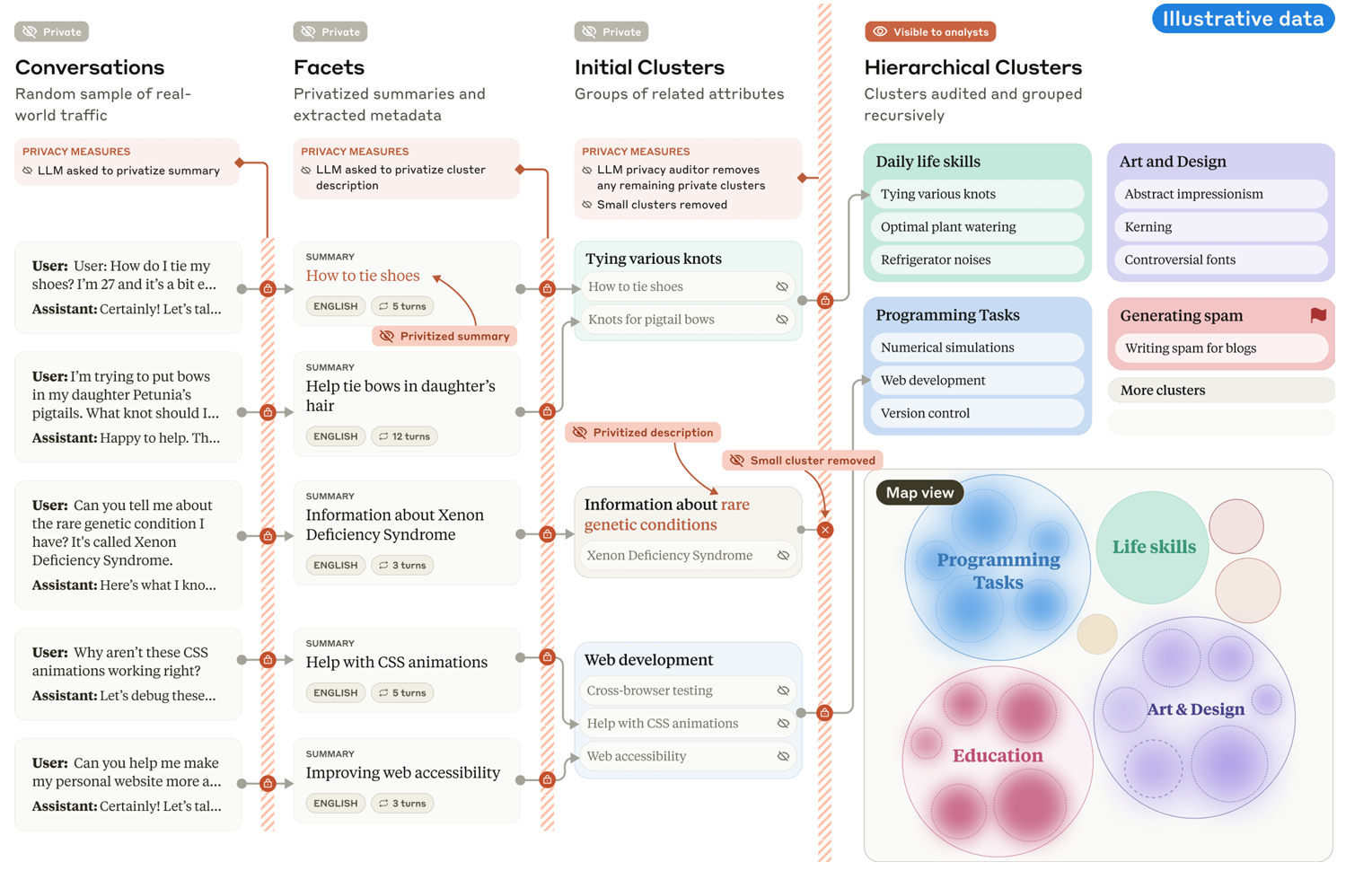 In a blog post, Anthropic said it preserves privacy of conversations by abstracting them into categories and clusters. All user data is anonymized and aggregated.