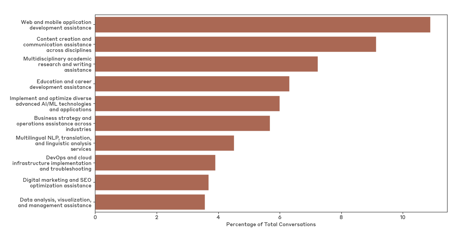 Web and mobile app development account for 10.4% of use cases with 9.2% focused on content creation and communication.