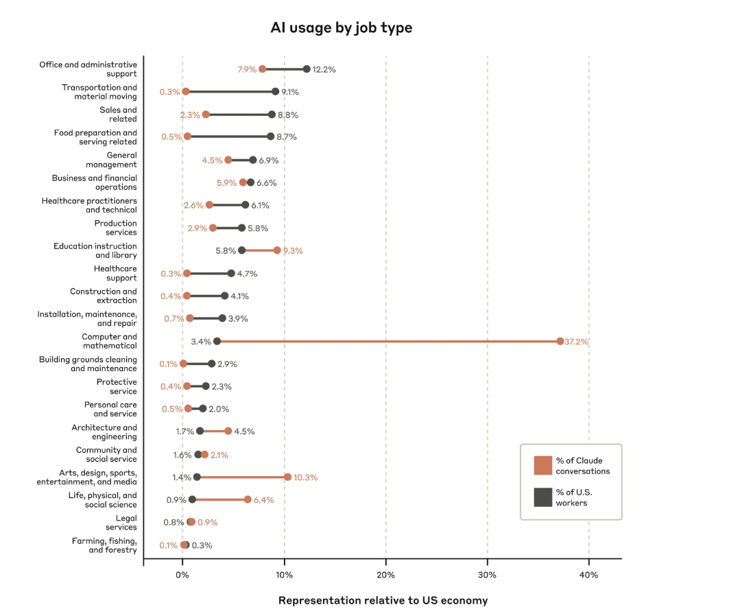 Perhaps the biggest takeaway from Anthropic's Economic Index is that the middle class of professions is facing the most augmentation. Computer and mathematics, art, design and media, life and physical social science, and education take up the most of Claude conversations.