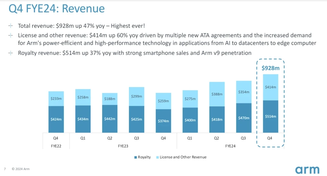 Future growth is all about royalty revenue from chips based on Armv9 designs. In the fourth quarter, Arm said Armv9 technology contributed 20% of royalty revenue due to smartphones, servers, IoT and networking devices. That's up from 15% in the third quarter.