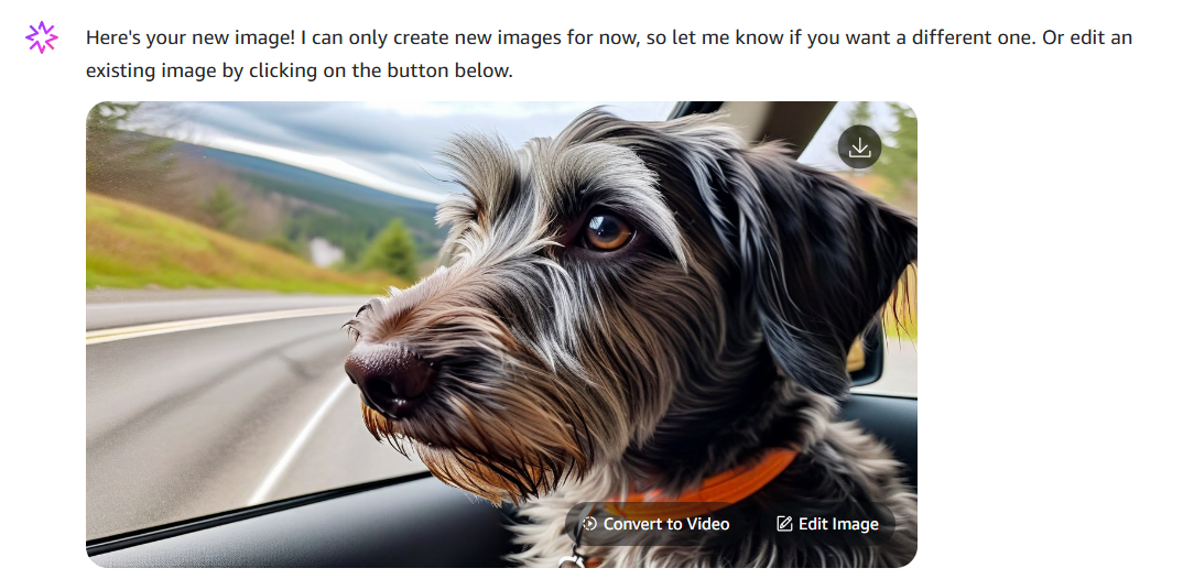Here's a look at an image of my dog. I asked for a watercolor, but Nova could only do some editing and provide variations. Converting to video was a nice touch.