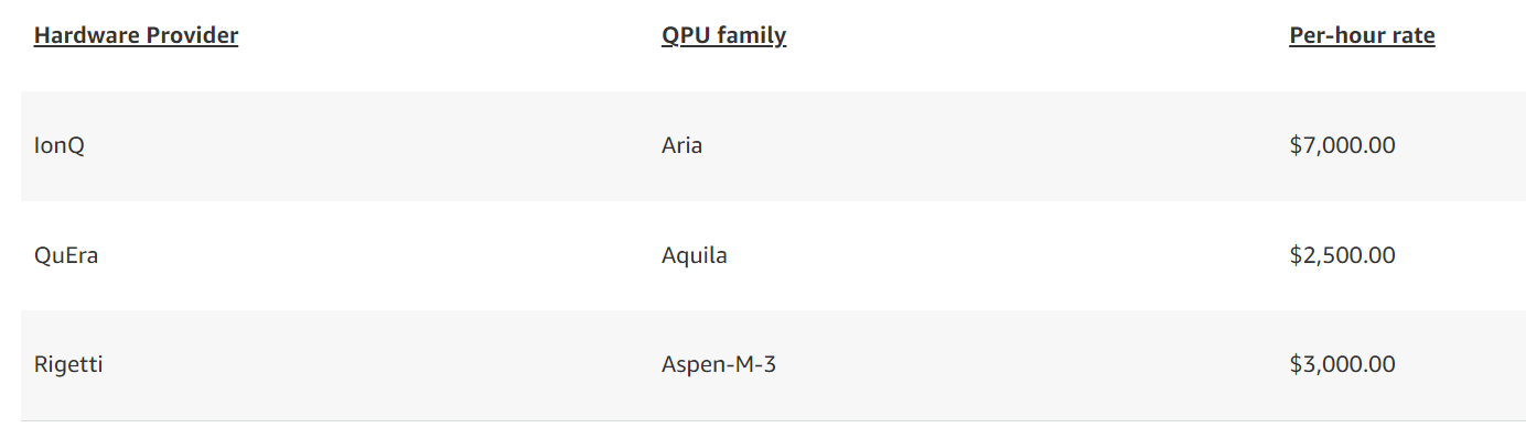 Pricing varies, but an IonQ system will run you $7,000 an hour, Rigetti goes for $3,000 an hour and QuEra is $2,500 an hour. Expert advice offerings are billed separately. Hybrid jobs have a different pricing setup. Here's a look at the Braket Direct QPU pricing.