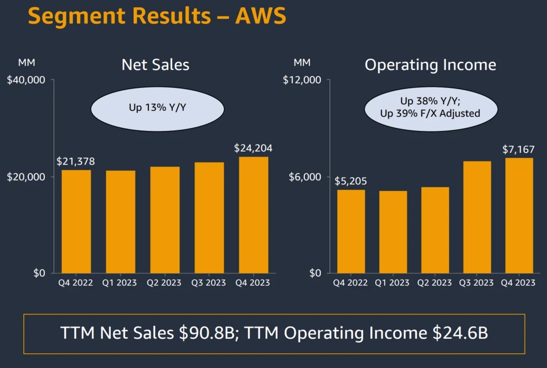 Amazon Web Services' fourth quarter revenue was $24.2 billion, up 13% from a year ago, and below the 30% and 26% growth rates put up by Microsoft Azure and Google Cloud, respectively.