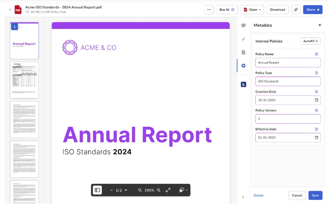 - Box AI Extract Agents, which automate metadata creation and provide insights from documents and images. Extract agents are built into Box experiences natively.
