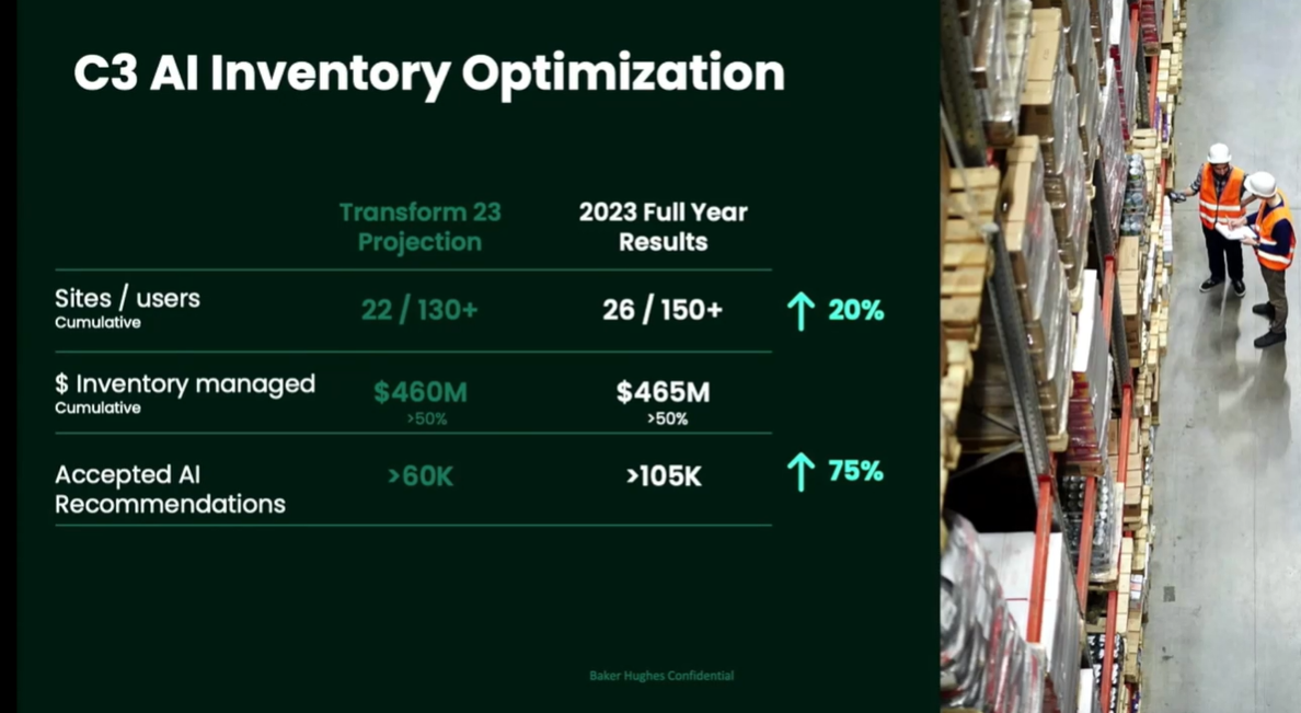 Jim Apostolides, Senior Vice President, Enterprise Operational Excellence at Baker Hughes, outlined how the company scaled C3 AI's platform. Apostolides now has more than 50% of inventory optimization accepted automatically without human intervention at the end of 2023. In 2021, that figure was 3%.