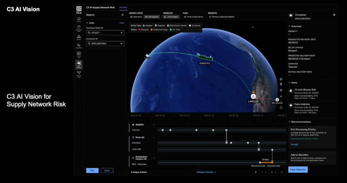 C3 AI outlined its product roadmap for the rest of the year and C3 AI Vision, which will provide spatial representations via data points. C3 AI Vision will cover a bevy of use cases for logistics, sourcing optimization, military, law enforcement, process optimization and aircraft readiness.