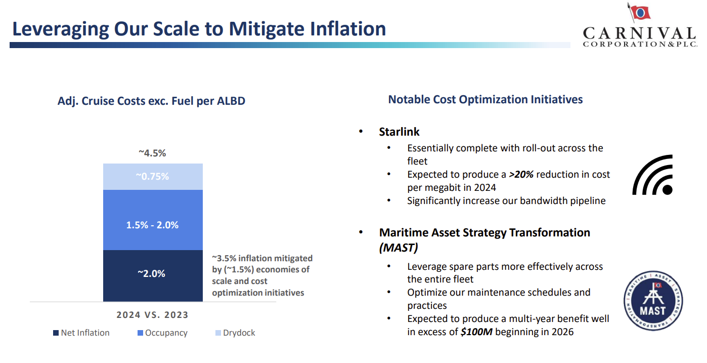 For 2024, Carnival said it will see higher ticket prices, onboard spending and occupancy rates across its brands while maintaining advertising spend at 2023 levels. While the MAST implementation is worth watching, Carnival is looking to save money by using Starlink for Internet access and continue to consume less fuel.