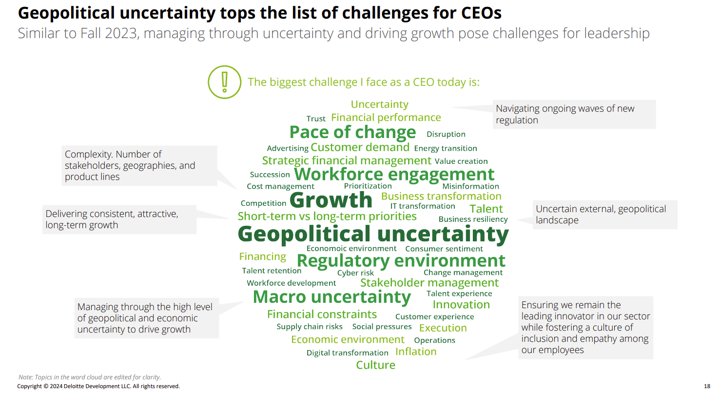 - Geopolitical instability was rated as the primary disruptor by 65% of CEOs surveyed.
