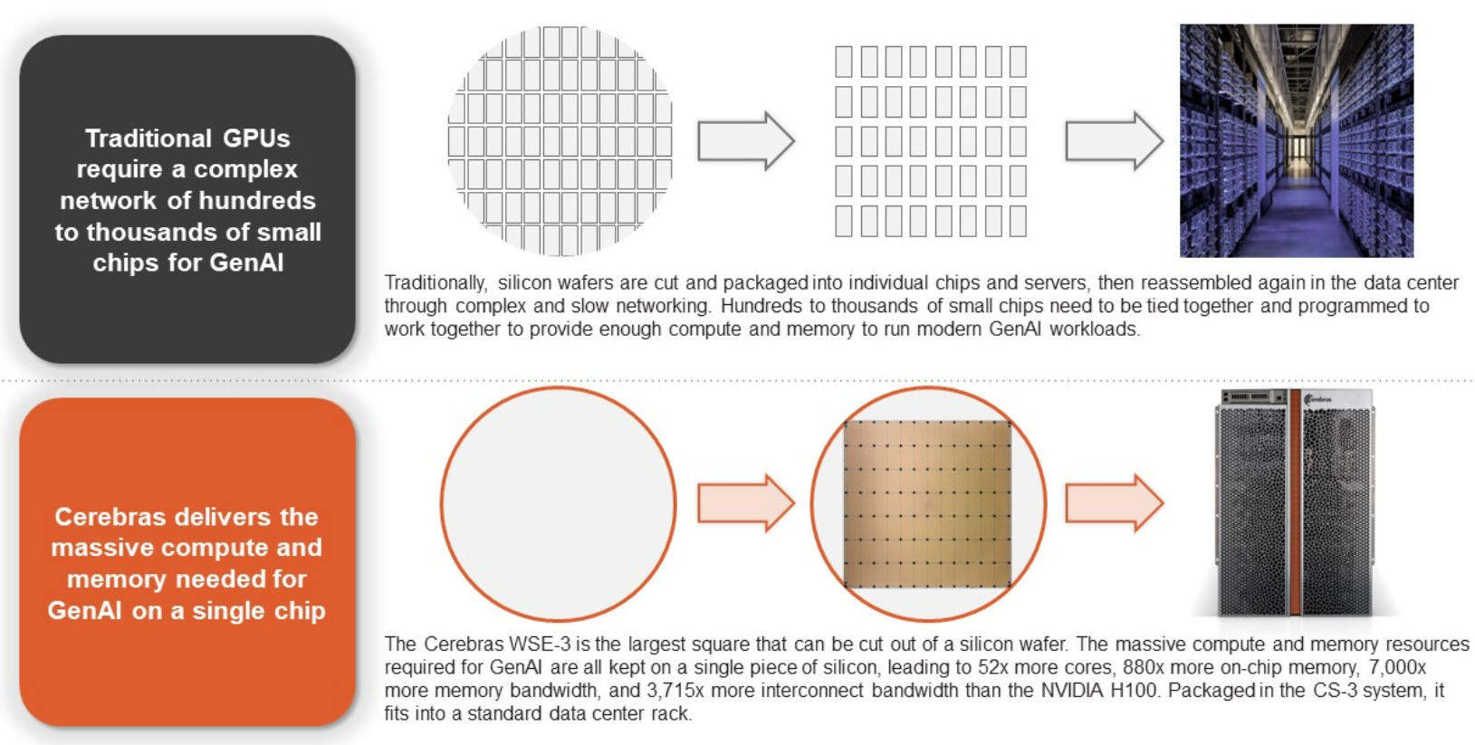 - Cerebras' processors are 57 times larger than the leading commercially available GPU. The company argues that its Cerebras Wafer-Scale Engine (CS-3) is the largest ever sold. It has 52 times more compute cores and 88 times more on-chip memory and 7,000 more memory bandwidth than leading GPUs. By keeping operations on the wafer, Cerebras' processors can solve problems faster with less power. Cerebras said its processors are designed for both AI training and inference.