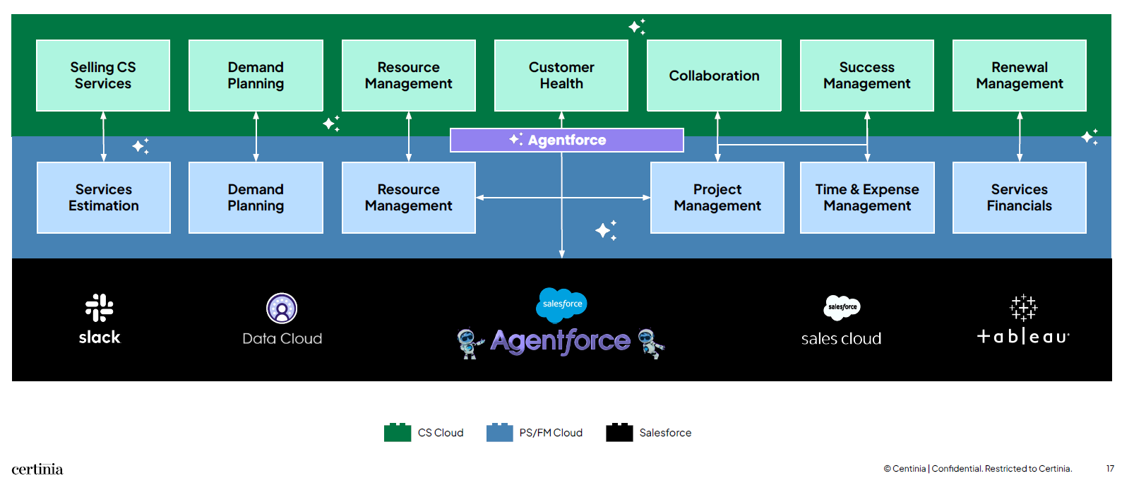 The company has three primary clouds--Professional Services (PS) Cloud, Financial Management Cloud and Customer Success (CS) Cloud--with Certinia AI layered throughout. Certinia, previously known as FinancialForce, is looking to address customers' need for productivity, AI innovation and rising labor costs. Certinia's platform plugs into enterprise ERP and CRM systems.