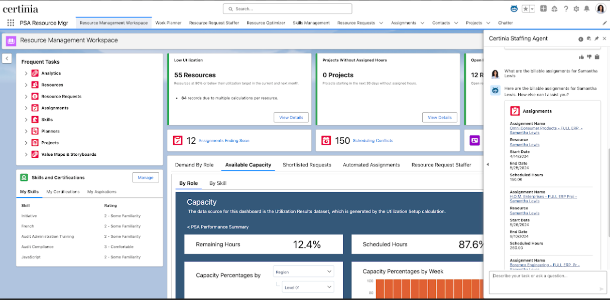 Certinia's Staffing Agent aims to begin resource allocation with a conversation. The staffing agent is native to Certinia's Professional Services (PS) Cloud. The agent will find billable assignments and provide a shortlist of suitable replacements. Once a manager makes a decision, the agent reallocates the work.