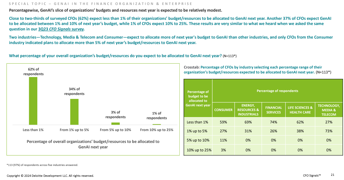 Sixty-two percent of CFOs say their organizations are allocating less than 1% of corporate budgets to generative AI next year, according to Deloitte's CFO Signals survey for the first quarter. Another 37% of CFOs expect 1% to 10% of budgets to be allocated to generative AI.