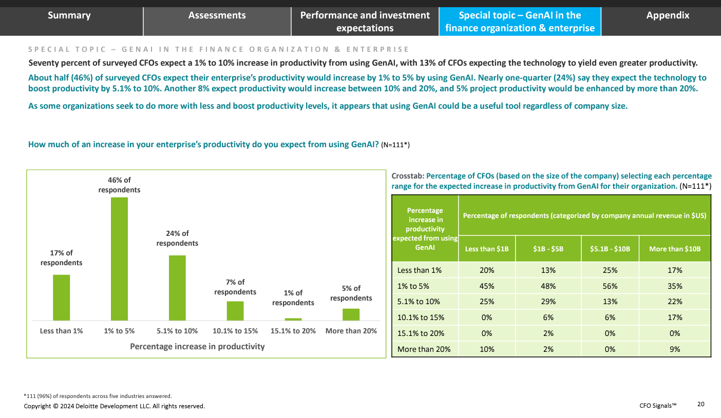 For instance, 9% of CFOs from companies with more than $10 billion in revenue are expecting productivity gains of more than 20% from genAI. Five percent of CFOs surveyed expect productivity gains of more than 20%.