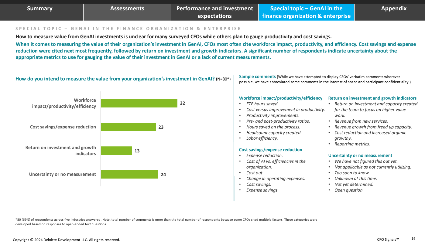 Going forward, CFOs are valuing generative AI on workforce productivity and cost savings. A big chunk of CFOs surveyed, 24%, are uncertain how to value generative AI or had no measurement.