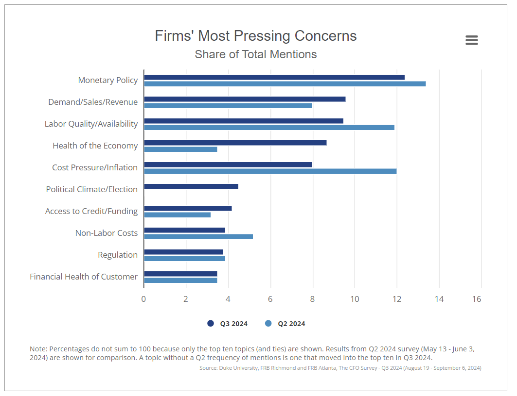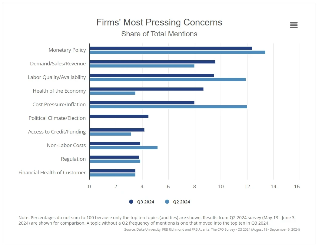 CFOs were more concerned about demand, sales and revenue in the third quarter than the second quarter. Concerns about inflation, labor and monetary policy receded in the third quarter compared to the second quarter.