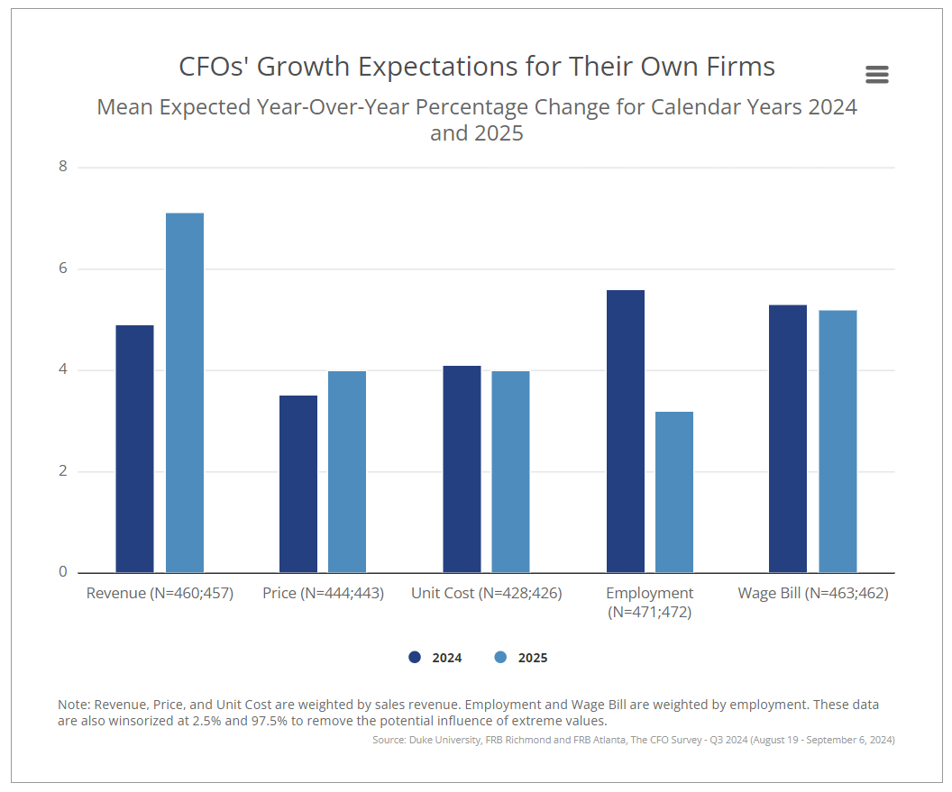 Duke University's Fuqua School of Business and the Federal Reserve Banks of Richmond and Atlanta released its third quarter The CFO Survey, which has 450 respondents.