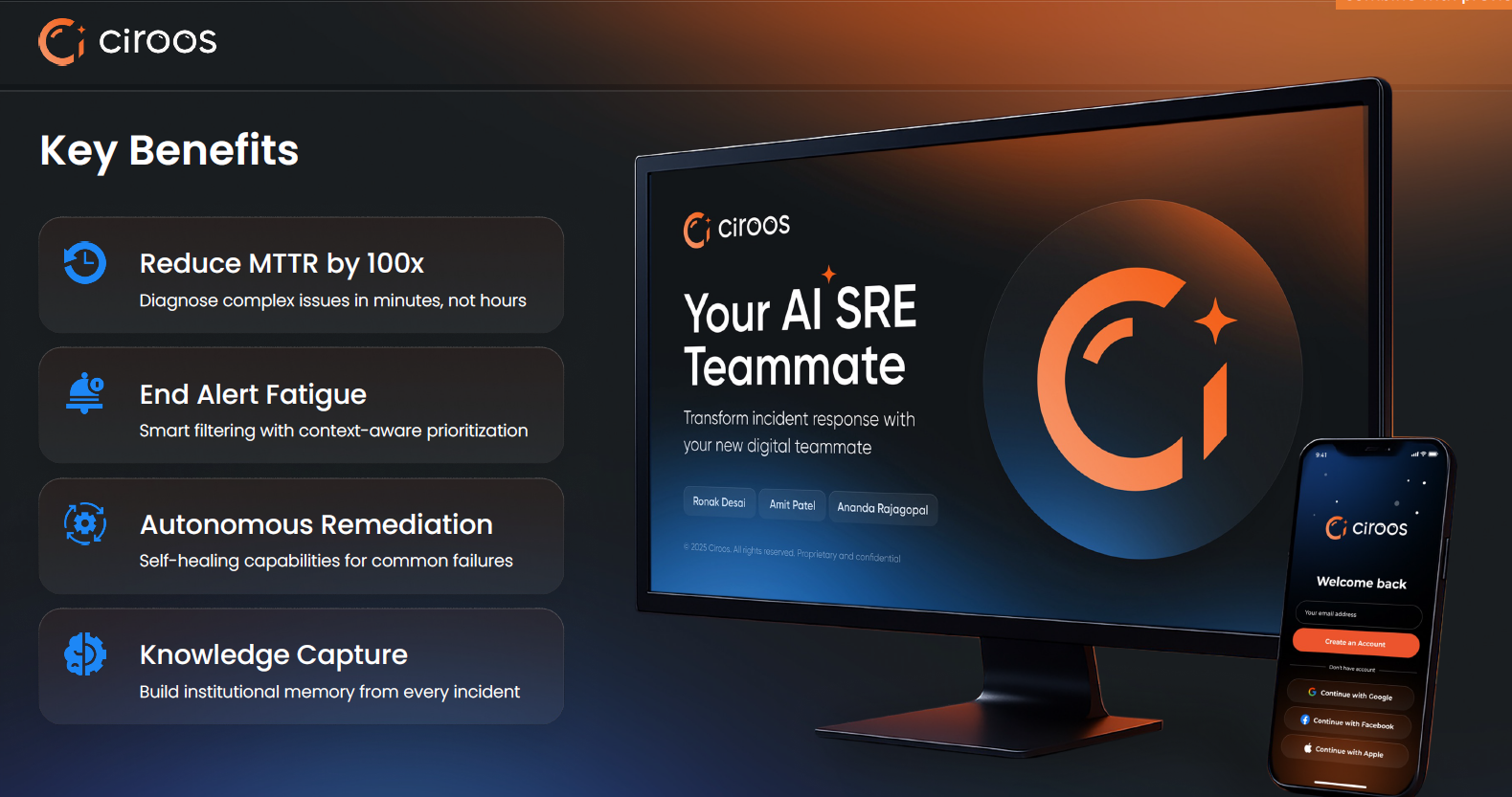 Ronak Desai, co-founder and CEO of Ciroos, said the company built its AI SRE Teammate to "end the toil" for SREs by accelerating root cause identification, automating actions, and giving back time and control to build reliable systems.