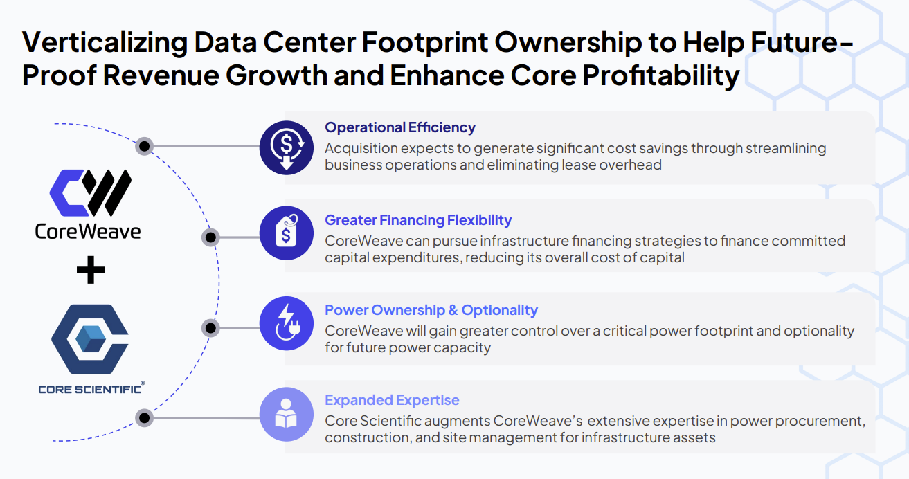 According to CoreWeave, the acquisition of Core Scientific will eliminate about $10 billion of future leases, create $500 million annual run rate cost savings by the end of 2027 and simplify operations.