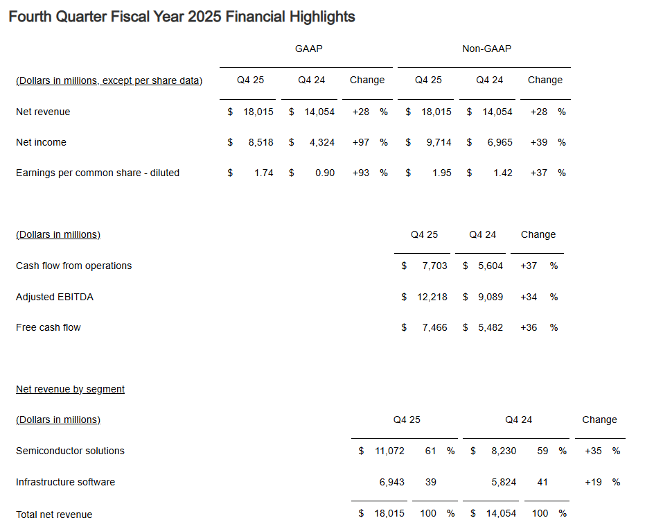 For fiscal 2025, Broadcom reported net income of $23.13 billion, or $4.77 a share, on revenue of $63.89 billion, up 24% from fiscal 2024.