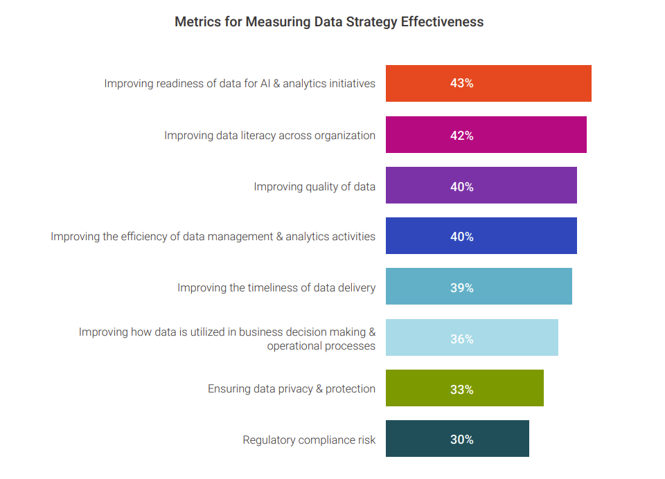Top data strategy priorities for 2024 include delivering reliable and consistent data fit for generative AI (39%), improving data-driven culture and data literacy (39%), and improving governance over data and data processes (38%). These priorities all highlight the need to push beyond implementing and toward maximizing AIâs efficacy and making the most of their investmentsâa point made even more clear by the 43% using AI readiness as a top metric for measuring their data strategy effectiveness."