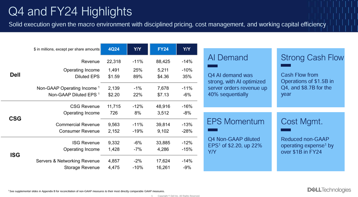 For fiscal 2024, Dell reported net income of $3.2 billion, or $4.36 a share, on revenue of $88.42 billion, down 14% from a year ago. The company said it expects to return to growth in fiscal 2025.