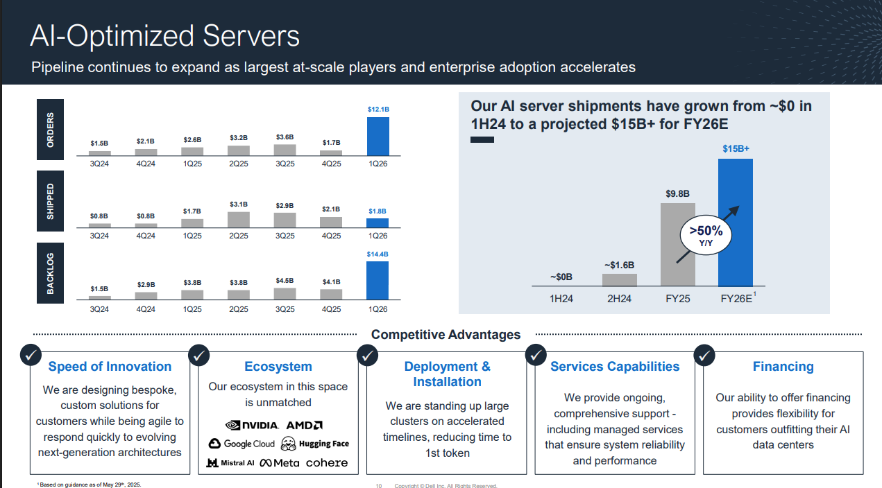 CFO Yvonne McGill noted that Dell's non-GAAP earnings grew three times faster than revenue. Chief Operating Officer Jeff Clarke said the company saw strong AI demand. "We're experiencing unprecedented demand for our AI-optimized servers. We generated $12.1 billion in AI orders this quarter alone, surpassing the entirety of shipments in all of FY25 and leaving us with $14.4 billion in backlog," he said.