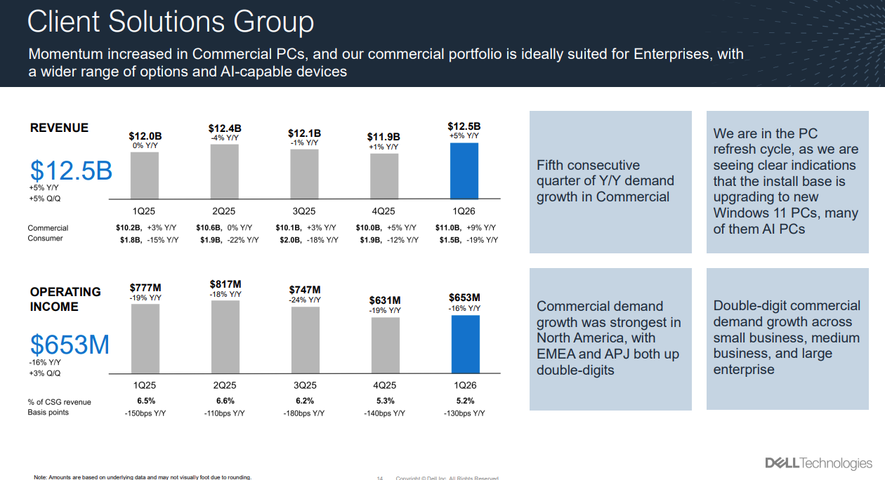 For the PC unit, also known as the client solutions group (CSG), revenue in the first quarter was $12.5 billion, up 5% from a year ago, with operating income of $653 million. Commercial client revenue was $11 billion, up 9% and consumer revenue was down 19% to $1.5 billion. Dell is primarily focused on business PCs.
