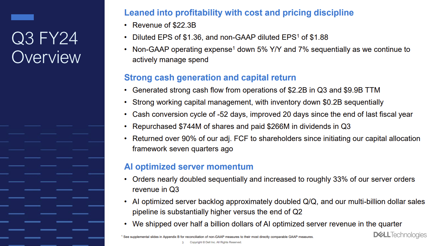According to the company, AI optimized servers accounted for 33% of total server orders revenue. Demand was driven by AI focused cloud providers and companies in key verticals. AI optimized server backlog nearly doubled in the third quarter from the second quarter.