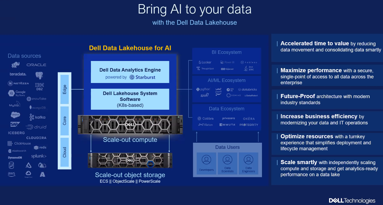 - Dell Data Lakehouse, which will have an analytics engine powered by Starburst.