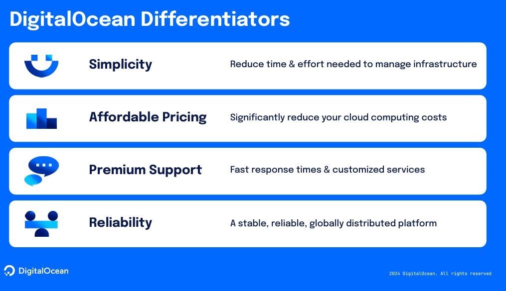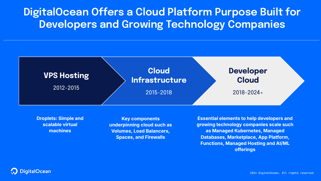 DigitalOcean has launched "GPU droplets" that allow customers to slice Nvidia H100 instances by 1, 8 or more GPUs, use case and budget limitations. The company also launched global load balancers as well as managed OpenSearch. DigitalOcean said 2024 revenue will be about $770 million to $775 million. To scale, DigitalOcean has hired a Chief Product and Technology Officer, Chief Ecosystem and Growth Officer and Chief Revenue Officer in recent weeks.