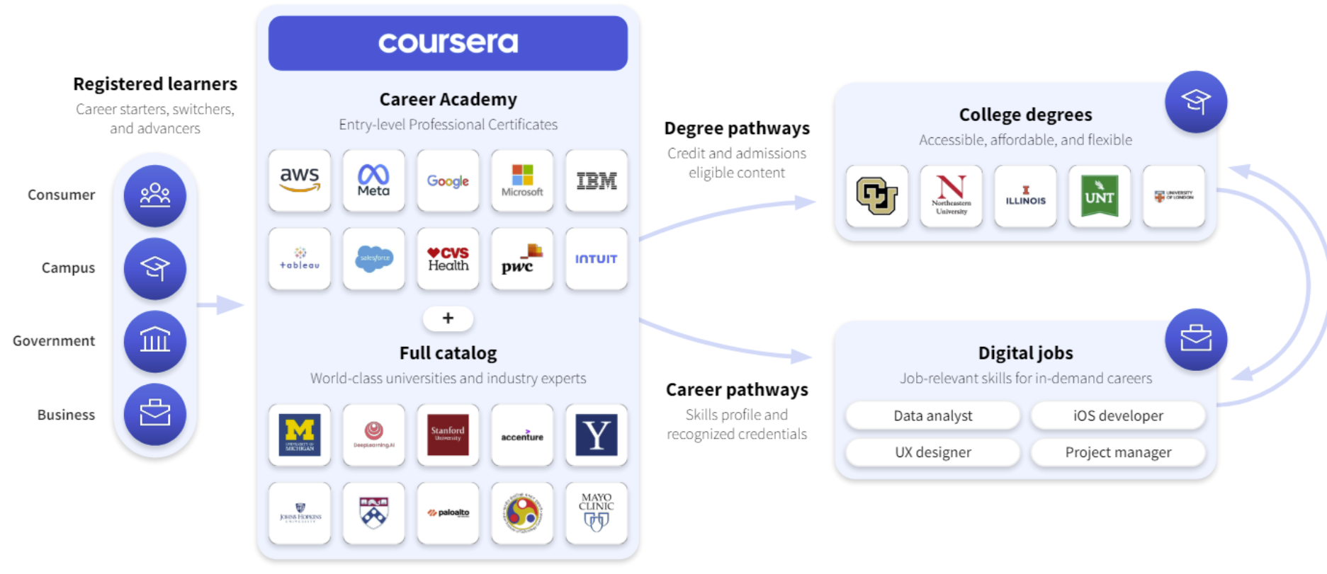 Coursera has three operating units--consumer, enterprise and degrees. Consumer revenue was up 18% in the first quarter compared to a year ago and enterprise and degrees revenue was up 10%. AI courses were driving demand in consumer and building in enterprise and degrees.