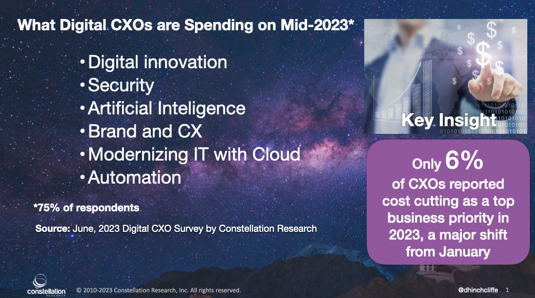 Constellation Research's 2023 H1 "CxO Business Confidence Survey" found that 32% of the IT budget is going to investments that add to top-line growth and 28% is going to efficiency. That balance is reflected in comments from enterprise technology vendors. Here's a look at what vendors say on earnings conference calls.