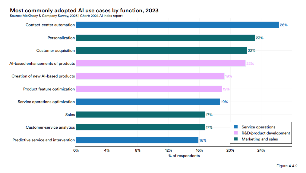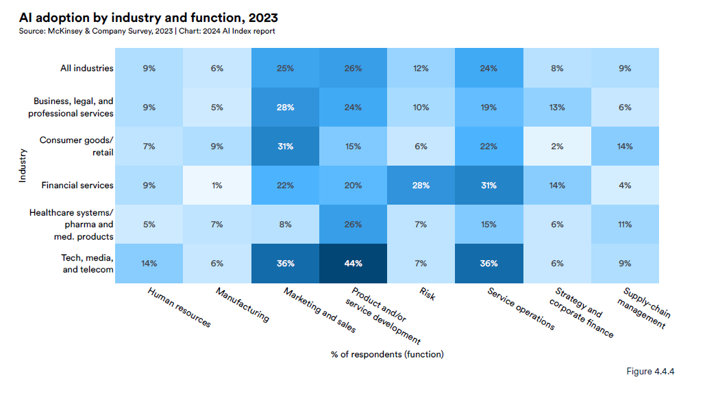 Data from the Stanford University's 2024 AI Index Report highlights how financial services is a standout when it comes to embedding AI into the business. Citing McKinsey data, the AI Index Report highlights how financial services stick out. Here's a few charts to ponder.