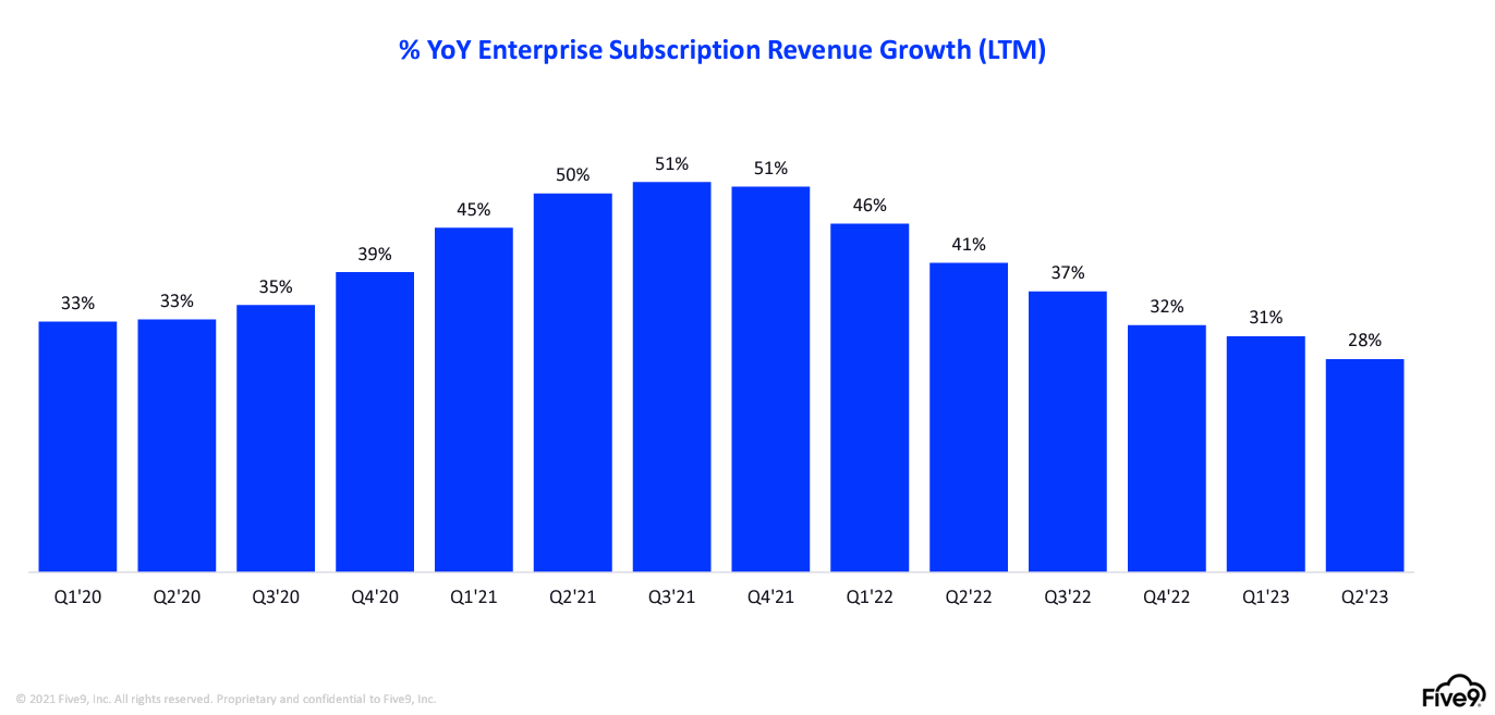 In the second quarter, Five9 reported enterprise subscription revenue growth of 28%. About 87% of Five9's revenue is enterprise.
