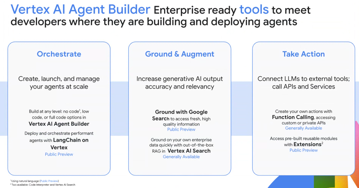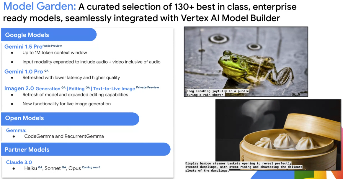 - On the model choice front, Google Cloud general availability for Gemini 1.0 and Gemini 1.5 Pro in public preview as well as Grounding on Google Search that will provide fresh information that's grounded. Google Cloud also announced Imagen 2.0 Editing in GA and private preview of text to live image, LangChain on Vertex AI and Vertex AI Prompt Management and Assistance.