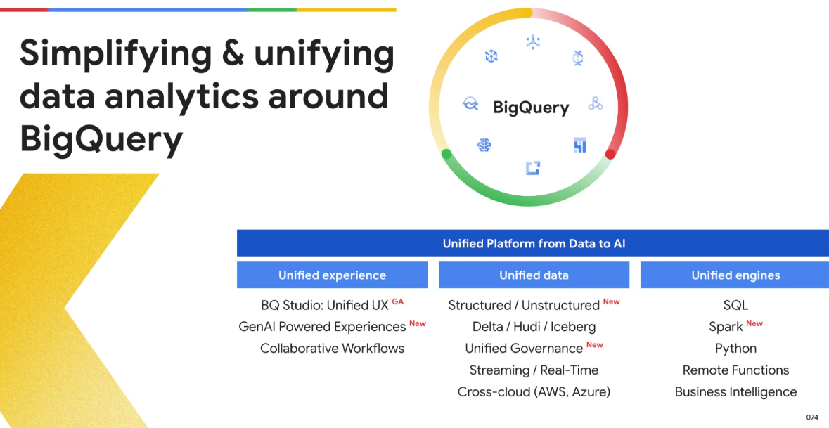 - On data analytics, BigQuery will become a unified platform for data to AI to support multimodal data and workloads with Gemini and a series of AI integrations. Specifically, BigQuery upgrades include a metastore for a unified data foundation, unified governance and cataloging and the addition of Apache Spark and Apache Kafka integration. Google Cloud is putting all of its data analytics services together on BigQuery.