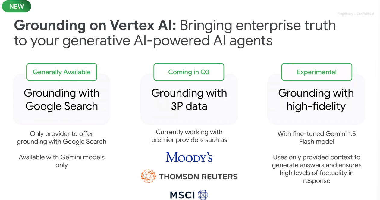 On the grounding front, Google is taking multiple approaches where it can leverage third party data and Google Search for timely prompts. The third-party grounding service will include data providers such as Moody's and Thomson Reuters.