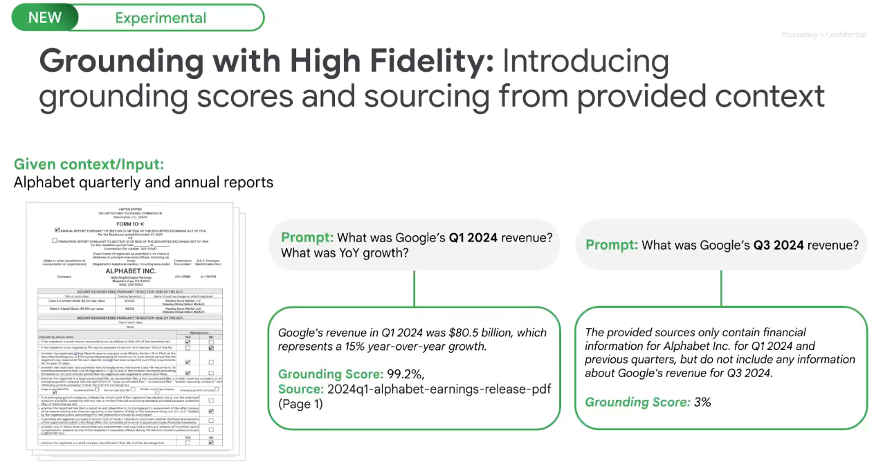 Grounding with high-fidelity mode is an experimental feature that includes a grounding score as well as a source. Kurian highlighted an example of a prompt asking about Alphabet's first quarter revenue and an answer with a grounding score. If the question was about Alphabet's third quarter 2024 earnings, the system looks at the context and notes that the quarter hasn't happened yet.