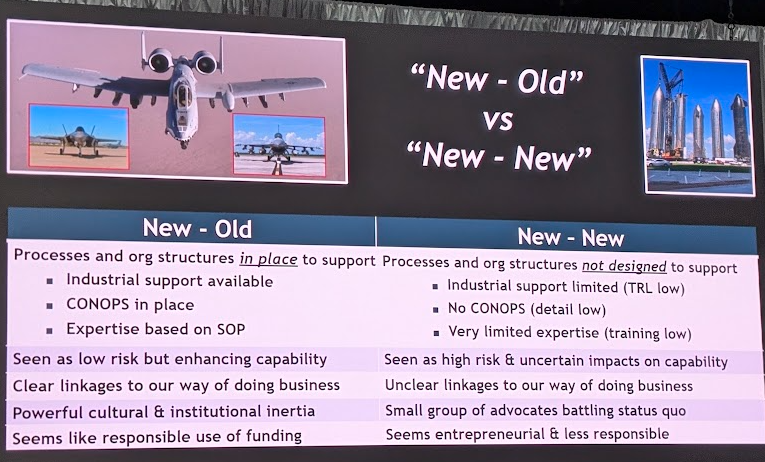 Budget issues aside, innovation is also a mindset. The government is good at creating what Saltzman calls "new-old." In a nutshell, new-old refers to developing new versions of old capabilities. "We take the F-16 and we build the F-22. The system is designed that way. The industrial support is available and we have our concept of operations," he said. "It's all based on standard operating procedure and it is seen as low risk to enhance what we already have."