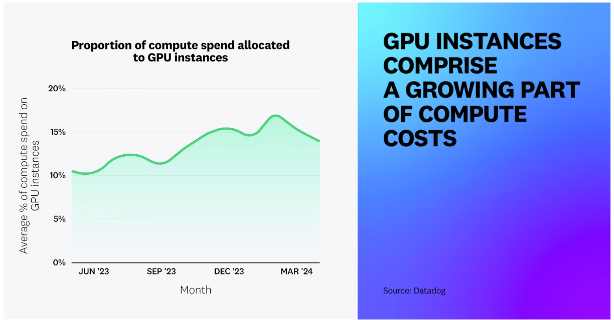 GPU instances are taking a larger share of cloud enterprise spending and now are 14% of compute costs compared to 10% a year ago, according to a Datadog report analyzing AWS customer usage.