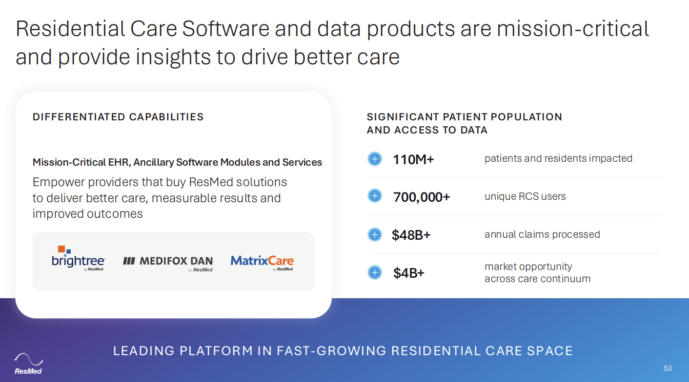 ResMed's data lake is one of the "deepest and most profound location of medical data on the planet," according to Farrell. That common data platform will continue to be an asset that unlocks value with de-identified data.