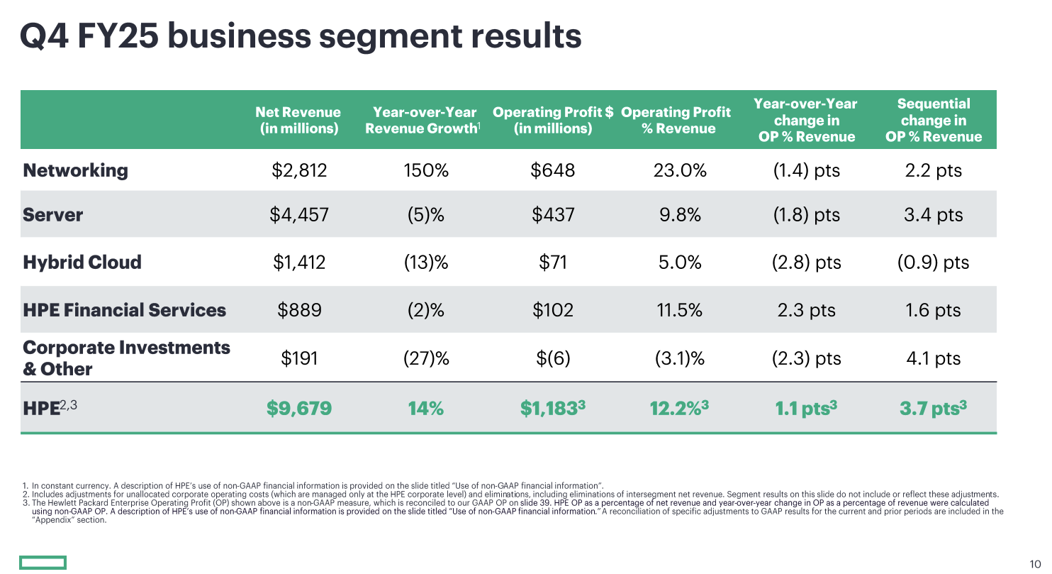 However, HPE's results were mixed by product line. For instance server revenue was down 5% to $4.5 billion. Networking revenue, boosted by the acquisition of Juniper Networks, was $2.8 billion, up 150% from a year ago. Hybrid cloud revenue was $1.2 billion, down 12% from a year ago.
