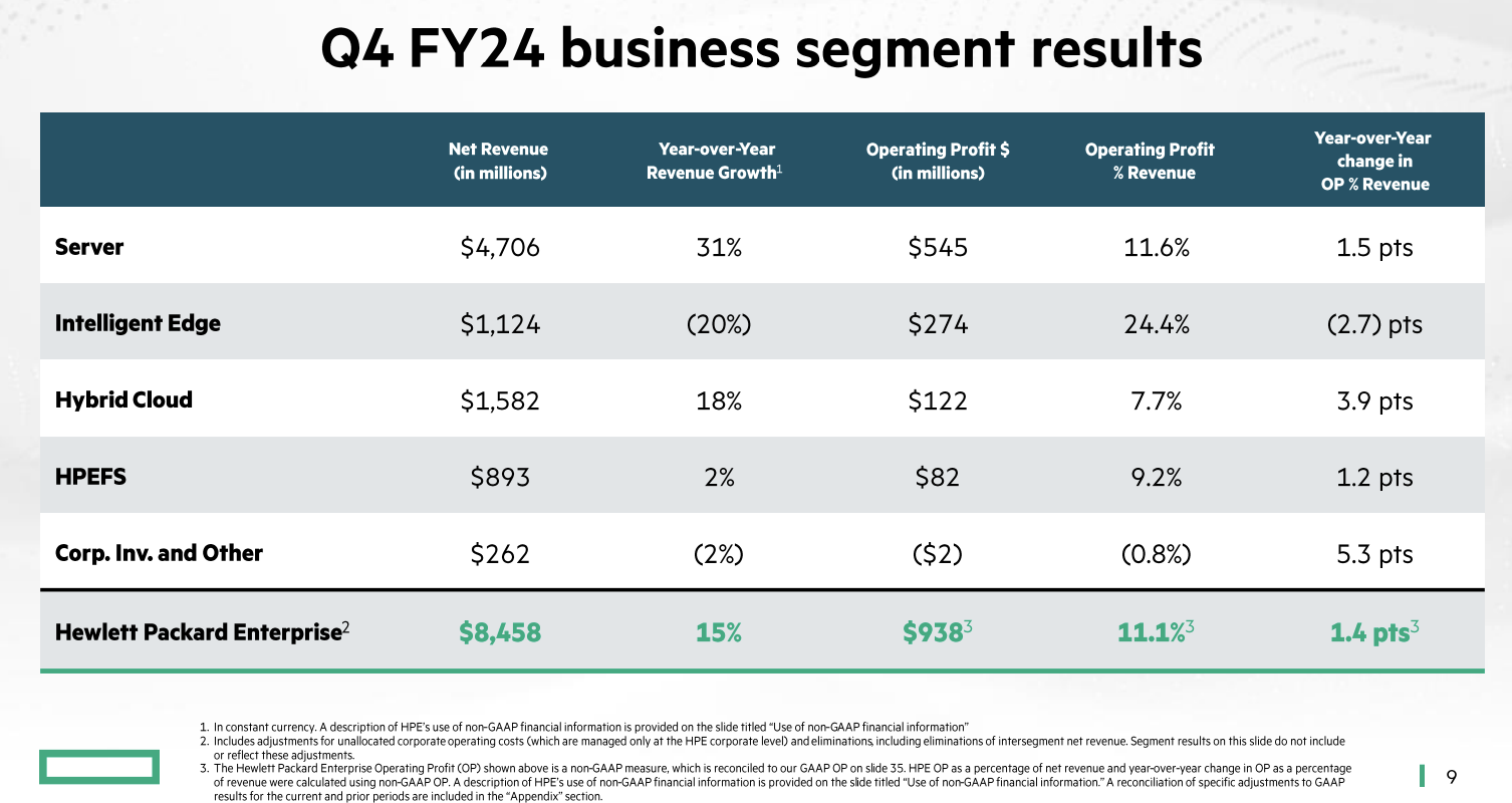 Server revenue in the fourth quarter was $4.7 billion, up 32% from a year ago. Intelligent edge revenue, which includes Aruba gear, was $1.1 billion, down 20% from a year ago. Hybrid cloud revenue was $1.6 billion, up 18% from a year ago.