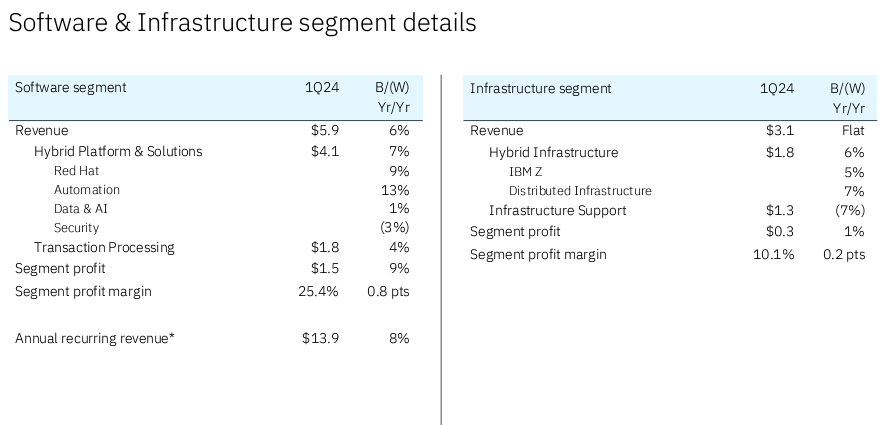 - In software, Red Hat revenue was up 9% with automation up 13%. Data and AI revenue was up 1% and security fell 3%.